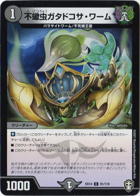 不蠍虫ガタドコサ・ワーム C 闇文明 (1) クリーチャー:パラサイトワーム/不死樹王国 1000 ブロッカー(このクリーチャーをタップして、相手クリーチャーの攻撃先をこのクリーチャーに変更してもよい) このクリーチャーは攻撃できない。 このクリーチャーがバトルゾーンに出た時、自分の山札の上から1枚目を墓地に置く。