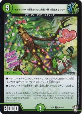 イルミツリー #夜景がやけに綺麗 #草 #草超えてツリー C 自然文明 (3) クリーチャー:ツリーフォーク/チームウェイブ 3000 マッハファイター(このクリーチャーは、バトルゾーンに出たターンの間、タップまたはアンタップしているクリーチャーを攻撃できる) このクリーチャーが破壊される時、墓地に置くかわりにマナゾーンに置く。