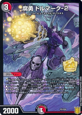 腐勇 ドルマーク-2 P 闇/火文明 (3) クリーチャー:ゴースト/ヒューマノイド/ディスタス 2000 G・ストライク(このクリーチャーを自分のシールドゾーンから手札に加える時、相手に見せ、相手のクリーチャーを1体選んでもよい。このターン、そのクリーチャーは攻撃できない) スレイヤー(このクリーチャーがバトルする時、バトルの後、相手クリーチャーを破壊する) ササゲール2(ディスペクターを召喚する時、コストを2少なくしてもよい。そうしたら、このクリーチャーを破壊する。そのディスペクターのコストは0以下にはならない)