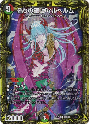 偽りの王 ヴィルヘルム SR 闇/火/自然文明 (9) クリーチャー:キング・コマンド・ドラゴン/アンノウン 12000 T・ブレイカー このクリーチャーが出た時、相手のクリーチャーを1体破壊する。その後、カードを1枚相手のマナゾーンから選び、持ち主の墓地に置く。 相手のカードがどこからでも墓地に置かれた時、自分の山札の上から1枚目をマナゾーンに置いてもよい。
