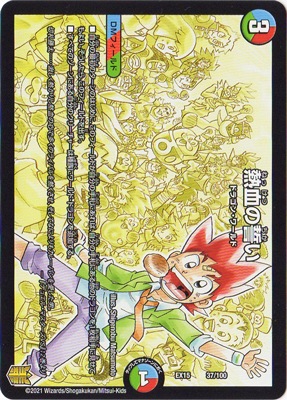 熱血の誓い P 水/火/自然文明 (3) DMフィールド:ドラゴン・ワールド 自分の最初のターンのはじめに、このフィールドが自分の手札にあれば、自分の手札にある他のドラゴンを1枚、相手に見せてもよい。そうしたら、このフィールドをバトルゾーンに出す。 すべてのゾーンにある自分のクリーチャーは種族にワールド・ドラゴンを追加する。