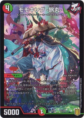モモキング -旅丸- P 火/自然文明 (4) クリーチャー:ヒーロー・ドラゴン/ジョーカーズ/レクスターズ 5000 相手のターン中、相手がマナゾーンのカードをタップせずにクリーチャーを出す時、相手はかわりにそのクリーチャーをマナゾーンに置く。 シンカパワー:このクリーチャーが進化する時、次の相手のターン中、相手は自身のマナゾーンのカードをタップせずにクリーチャーを出せない。