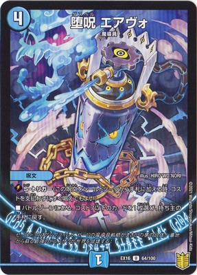 堕呪 エアヴォ UC 水文明 (4) 呪文:魔導具 S・トリガー バトルゾーンにある、コスト7以下のカードを1枚選び、持ち主の手札に戻す。