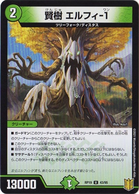 賢樹 エルフィ-1 UC 自然文明 (2) クリーチャー:ツリーフォーク/ディスタス 13000 ガードマン(このクリーチャーをタップして、相手クリーチャーの攻撃先を、自分の他のクリーチャーからこのクリーチャーに変更してもよい) このクリーチャーは攻撃できない。 自分のディスタスの召喚コストを1少なくする。ただし、コストは0以下にはならない。 ササゲール1(ディスペクターを召喚する時、コストを1少なくしてもよい。そうしたら、このクリーチャーを破壊する。そのディスペクターのコストは0以下にはならない)