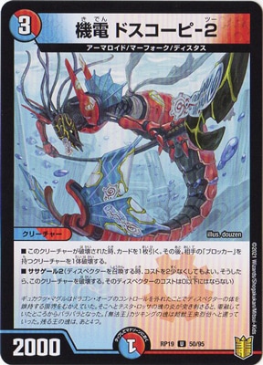 機電 ドスコーピ-2 UC 水/火文明 (3) クリーチャー:アーマロイド/マーフォーク/ディスタス 2000 このクリーチャーが破壊された時、カードを1枚引く。その後、相手の「ブロッカー」を持つクリーチャーを1体破壊する。 ササゲール2(ディスペクターを召喚する時、コストを2少なくしてもよい。そうしたら、このクリーチャーを破壊する。そのディスペクターのコストは0以下にはならない)