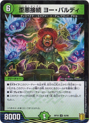 歪悪接続 ヨー・バルディ UC 自然文明 (6) クリーチャー:ディスペクター/ミステリー・トーテム/グランド・デビル 8000 EXライフ(このクリーチャーを出す時、自分の山札の上から1枚目をシールド化する。このクリーチャーが離れる時、かわりにそのシールドを墓地に置く) W・ブレイカー(このクリーチャーはシールドを2つブレイクする) このクリーチャーが出た時、ディスタスを1体、自分のマナゾーンから出してもよい。