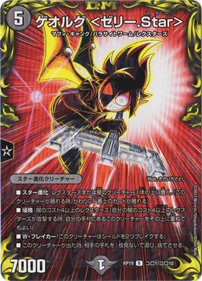 ゲオルグ <ゼリー.Star> R 闇文明 (5) スター進化クリーチャー:マフィ・ギャング/パラサイトワーム/レクスターズ 7000 スター進化:レクスターズまたは闇のクリーチャー1体の上に置く。(このクリーチャーが離れる時、かわりに一番上のカードが離れる) 侵略:闇のコスト4以上のレクスターズ(自分の闇のコスト4以上のレクスターズが攻撃する時、自分の手札にあるこのクリーチャーをその上に重ねてもよい) W・ブレイカー(このクリーチャーはシールドを2つブレイクする) このクリーチャーが出た時、相手の手札を1枚見ないで選び、捨てさせる。