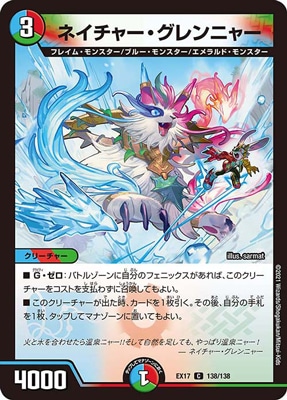 ネイチャー・グレンニャー C 水/火/自然文明 (3) クリーチャー:フレイム・モンスター/ブルー・モンスター/エメラルド・モンスター 4000 G・ゼロ:バトルゾーンに自分のフェニックスがあれば、このクリーチャーをコストを支払わずに召喚してもよい。 このクリーチャーが出た時、カードを1枚引く。その後、自分の手札を1枚、タップしてマナゾーンに置いてもよい。