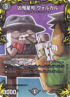 凶鬼星号 ヴォルガル C 闇文明 (3) クリーチャー:マフィ・ギャング/レクスターズ 3000 このクリーチャーが攻撃された時または相手に選ばれた時、相手は自身の手札を1枚選び、捨てる。 シンカパワー:このクリーチャーが進化する時、相手は自身の手札を1枚選び、捨てる。