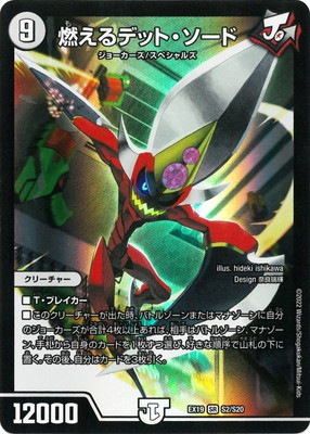 燃えるデット・ソード SR 無色[ジョーカーズ] (9) クリーチャー:ジョーカーズ/スペシャルズ 12000 T・ブレイカー このクリーチャーがバトルゾーンに出た時、バトルゾーンまたはマナゾーンに自分のジョーカーズが合計4枚以上あれば、相手はバトルゾーン、マナゾーン、手札から自身のカードを1枚ずつ選び、好きな順序で山札の一番下に置く。その後、自分はカードを3枚引く。