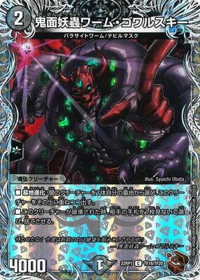 鬼面妖蟲ワーム・ゴワルスキー C 闇文明 (2) 進化クリーチャー:パラサイトワーム/デビルマスク 4000 墓地進化?闇のクリーチャーを1体自分の墓地から選び、このクリーチャーをその上に重ねつつバトルゾーンに出す。 このクリーチャーが破壊された時、相手の手札を1枚見ないで選び、捨てさせる。