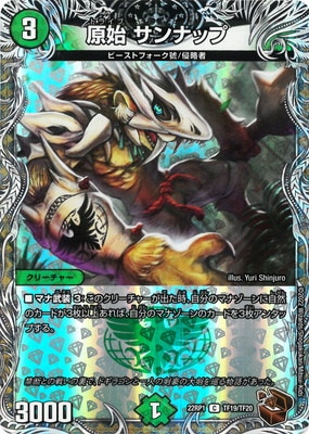 原始 サンナップ C 自然文明 (3) クリーチャー:ビーストフォーク號/侵略者 3000 マナ武装3:このクリーチャーが出た時、自分のマナゾーンに自然のカードが3枚以上あれば、自分のマナゾーンのカードを3枚アンタップする。