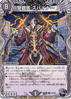 撃髄医 スパイナー R 闇文明 (9) クリーチャー:マフィ・ギャング 2000 スーパー・S・トリガー(このクリーチャーを自分のシールドゾーンから手札に加える時、コストを支払わずにすぐ召喚してもよい。その時自分のシールドが1つもなければ、このクリーチャーにS能力を与える) このクリーチャーがバトルゾーンに出た時、次の能力を3回行う。 相手のクリーチャーを1体選ぶ。このターン、そのクリーチャーのパワーを-3000する。 S?このクリーチャーがバトルゾーンに出た時、コスト4以下のクリーチャーを好きな数、自分の墓地からバトルゾーンに出す。