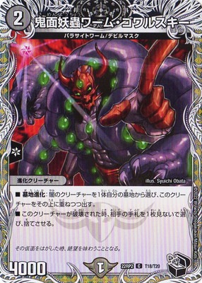 鬼面妖蟲ワーム・ゴワルスキー C 闇文明 (2) 進化クリーチャー:パラサイトワーム/デビルマスク 4000 墓地進化?闇のクリーチャーを1体自分の墓地から選び、このクリーチャーをその上に重ねつつバトルゾーンに出す。 このクリーチャーが破壊された時、相手の手札を1枚見ないで選び、捨てさせる。