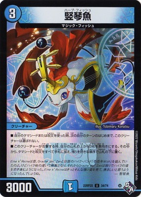 竪琴魚 UC 水文明 (3) クリーチャー:マジック・フィッシュ 3000 自分のタマシードまたは呪文を使った時、次の自分のターンのはじめまで、このクリーチャーは選ばれない。 このクリーチャーが攻撃する時、自分の山札の上から3枚を表向きにする。その中から、タマシードと呪文をすべて手札に加え、残りを好きな順序で山札の下に置く。