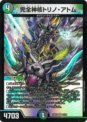 完全神核トリノ・アトム VR 水/闇/自然文明 (4) クリーチャー:オリジン/クリエイター 4703 ジャストダイバー(このクリーチャーが出た時、次の自分のターンのはじめまで、このクリーチャーは相手に選ばれず攻撃されない) 自分のターンのはじめに、自分の山札の上から1枚目を表向きにする。 そのカードのコストが、自分のマナゾーンの枚数以下なら、コストを支払わずに使ってもよい。そのカードのコストが自分のマナゾーンの枚数より大きい場合、または、使わない場合、そのカードをマナゾーンに置く。 相手のターンの終わりに、自分の手札をすべて捨てる。