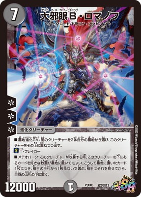 大邪眼B・ロマノフ SR 闇文明 (7) 進化クリーチャー:ダークロード/ドラゴン・ゾンビ/ナイト 12000 墓地進化GV?闇のクリーチャーを3体自分の墓地から選び、このクリーチャーをその上に重ねつつバトルゾーンに出す。 メテオバーン?このクリーチャーが攻撃する時、このクリーチャーの下にあるカードを好きな数選び墓地に置いてもよい。こうして墓地に置いたカード1枚につき、相手の手札から1枚見ないで選ぶ。相手はそれを見せてから、自身の山札の一番下に置く。 T・ブレイカー