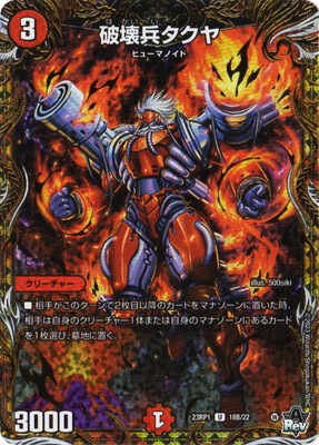 破壊兵タクヤ UC 火文明 (3) クリーチャー:ヒューマノイド 3000 相手がこのターンで2枚目以降のカードをマナゾーンに置いた時、相手は自身のクリーチャー1体または自身のマナゾーンにあるカードを1枚選び、墓地に置く。