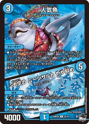 人気魚 UC 水文明 (3) クリーチャー:マジック・フィッシュ 4000 自分のターンのはじめに、このクリーチャーを手札に戻してもよい。そうしたら、マジック・メクレイド5する。(マジック・メクレイド5:自分の山札の上から3枚を見る。その中から、コスト5以下のマジックを1枚、コストを支払わずに使ってもよい。残りを好きな順序で山札の下に置く) ♪大空の ムーンサルト やや斜め UC 水文明 (5) 呪文:マジック・ソング S・トリガー(この呪文をシールドゾーンから手札に加える時、コストを支払わずにすぐ唱えてもよい) 相手は自身のアンタップしているクリーチャーを2体選び、手札に戻す。