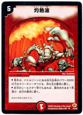 灼熱波 UC 火文明 (5) 呪文 相手は、バトルゾーンにある自分自身のパワー3000以下のクリーチャーすべてを、持ち主の墓地に置く。 自分のシールドが1枚でもあれば、裏向きのまま1枚選び、自分の墓地に置く。