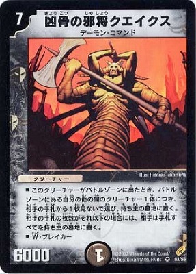 凶骨の邪将クエイクス VR 闇文明 (7) クリーチャー:デーモン・コマンド 6000 このクリーチャーをバトルゾーンに出した時、バトルゾーンにある自分の他の闇のクリーチャー1体につき相手の手札を1枚見ないで選び、捨てさせる。 W・ブレイカー