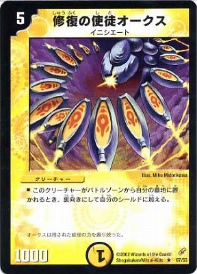修復の使徒オークス R 光文明 (5) クリーチャー:イニシエート 1000 このクリーチャーがバトルゾーンから自分の墓地に置かれるとき、裏向きにして自分のシールドに加える。