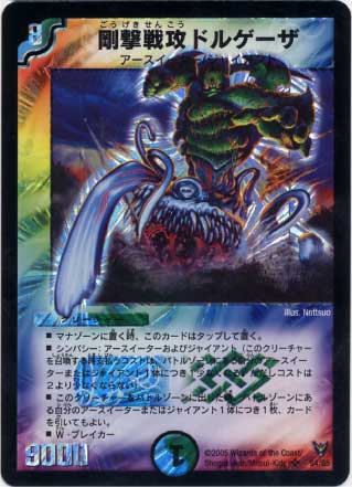 剛撃戦攻ドルゲーザ SR /自然文明 (8) クリーチャー:アースイーター/ジャイアント 9000 マナゾーンに置く時、このカードはタップして置く。 シンパシー:アースイーターおよびジャイアント(このクリーチャーを召喚する時支払うコストは、バトルゾーンにある自分のアースイーターまたはジャイアント1体につき1少なくなる。ただしコストは2より少なくならない) このクリーチャーをバトルゾーンに出した時、バトルゾーンにある自分のアースイーター1体につき1枚、カードを引いてもよい。その後、バトルゾーンにある自分のジャイアント1体につき1枚、カードを引いてもよい。 W・ブレイカー