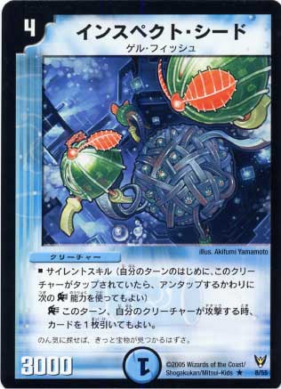 インスペクト・シード R 水文明 (4) クリーチャー:ゲル・フィッシュ 3000 サイレントスキル SS−このターン、自分のクリーチャーが攻撃する時、カードを1枚引いてもよい。
