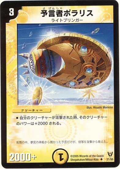 予言者ポラリス UC 光文明 (3) クリーチャー:ライトブリンガー 2000+ 自分のクリーチャーが攻撃された時、そのクリーチャーのパワーは+2000される。