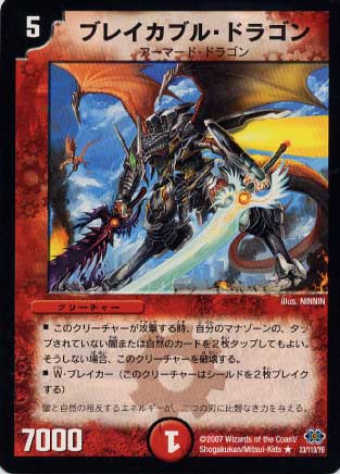 ブレイカブル・ドラゴン R 火文明// (5) クリーチャー:アーマード・ドラゴン 7000 このクリーチャーが攻撃する時、自分のマナゾーンの、タップされていない闇または自然のカードを2枚タップしてもよい。そうしない場合、このクリーチャーを破壊する。 W・ブレイカー