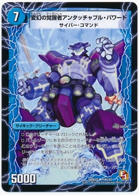 1000 バトルゾーンにある自分のクリーチャーを相手が選ぶ時、このクリーチャーを選ぶことはできない。(ただし、このクリーチャーを攻撃またはブロックしてもよい) 覚醒−各ターンの終わりに、自分の他のサイキック・クリーチャーがそのターン覚醒されていた場合、このクリーチャーをコストの大きいほうに裏返す。 変幻の覚醒者アンタッチャブル・パワード UC 水文明 (7) サイキック・クリーチャー:サイバー・コマンド