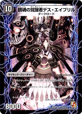 5000 覚醒−このクリーチャーが相手プレイヤーを攻撃してブロックされなかった時、相手は自身の手札を1枚選んで捨てる。その攻撃の後、このクリーチャーをコストの大きいほうに裏返す。 鎮魂の覚醒者デス・エイプリル UC 闇文明 (10) サイキック・クリーチャー:ダークロード