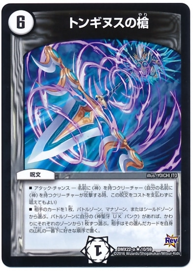トンギヌスの槍 R 無色 (6) 呪文 アタック・チャンス−名前に《神(シェン)》を持つクリーチャー(自分の名前に《神(シェン)》を持つクリーチャーが攻撃する時、この呪文をコストを支払わずに唱えてもよい) 相手のカードを1枚、バトルゾーン、マナゾーン、またはシールドゾーンから選ぶ。バトルゾーンに自分の 《神聖牙 UK パンク》があれば、かわりにそれぞれのゾーンから1枚ずつ選ぶ。相手はその選んだカードを自身の山札の一番下に好きな順序で置く。