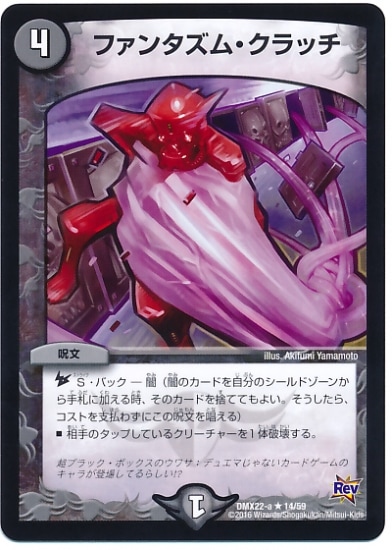 ファンタズム・クラッチ R 闇文明 (4) 呪文 S・バック−闇 相手のタップしているクリーチャーを1体破壊する。