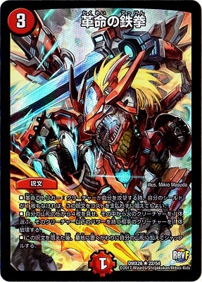 革命の鉄拳 R 火文明// (3) 呪文 革命0トリガー―クリーチャーが自分を攻撃する時、自分のシールドが1枚もなければ、この呪文をコストを支払わずに唱えてもよい。 自分の山札の上から4枚を見せ、その中から火のクリーチャーを1体選ぶ。そのクリーチャー以下のパワーを持つ相手のクリーチャーを1体破壊する。 この呪文を唱えた後、墓地に置くかわりに自分の山札に加えてシャッフルする。