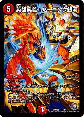 英雄奥義 バーニング銀河 P 火文明// (5) 呪文 S・トリガー バトルゾーンにある相手のコスト5以下のカードを1枚選び、持ち主の墓地に置く。 マナ武装7:自分のマナゾーンに火のカードが7枚以上あれば、バトルゾーンにある相手のコスト12以下のカードを1枚選び、持ち主の墓地に置く。