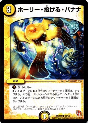 ホーリー・投げる・バナナ C 光文明 (3) 呪文 S・トリガー バトルゾーンにある相手のクリーチャーを1体選び、タップする。その後、バトルゾーンにある自分のハンター