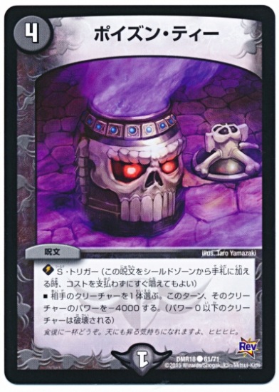 ポイズン・ティー C 闇文明 (4) 呪文 S・トリガー(この呪文をシールドゾーンから手札に加える時、コストを支払わずにすぐ唱えてもよい) 相手のクリーチャーを1体選ぶ。このターン、そのクリーチャーのパワーを−4000する。(パワー0以下のクリーチャーは破壊される)