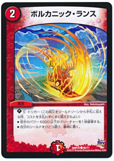 ボルカニック・ランス C 火文明// (2) 呪文 S・トリガー 相手のパワー6000以下のクリーチャーを1体破壊する。 自分のシールドをひとつ選び、墓地に置く。