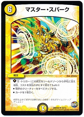 マスター・スパーク UC 光文明 (6) 呪文 S・トリガー(この呪文をシールドゾーンから手札に加える時、コストを支払わずにすぐ唱えてもよい) 相手のクリーチャーをすべてタップする。 カードを1枚引く。