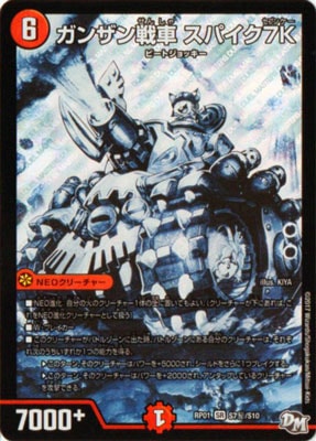 ガンザン戦車 スパイク7K SR 火文明 (6) NEOクリーチャー:ビートジョッキー 7000+ NEO進化:自分の火のクリーチャー1体の上に置いてもよい W・ブレイカー このクリーチャーがバトルゾーンに出た時、バトルゾーンにある自分のクリーチャーは、それぞれ次のうちいずれか1つの能力を得る。 ?このターン、そのクリーチャーのパワーは+5000され、シールドをさらに1つブレイクする。 ?このターン、そのクリーチャーのパワーは+2000され、アンタップしているクリーチャーを攻撃できる。