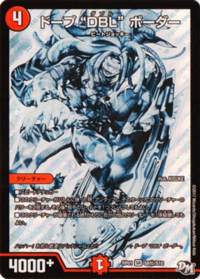 ドープ "DBL(ダブル)" ボーダー SR 火文明 (4) クリーチャー:ビートジョッキー 4000+ スピードアタッカー このクリーチャーがバトルに勝った時、アンタップし、そのターン、このクリーチャーのパワーを2倍する。その後、相手のシールドを1つブレイクしてもよい。 このクリーチャーが破壊される時、かわりに自分の他のクリーチャーを1体破壊してもよい。