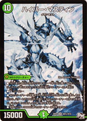 ハイパー・マスティン SR 自然文明/ (10) NEOクリーチャー:グランセクト 15000 NEO進化:自分の自然のクリーチャー1体の上に置いてもよい T・ブレイカー このクリーチャーが攻撃する時、自分の山札の上から3枚を見る。その中から、パワー12000以上の進化ではないクリーチャーを好きな数選び、バトルゾーンに出す。その後、残りを手札に加える。 相手のパワー3000以下のクリーチャーは攻撃できない。
