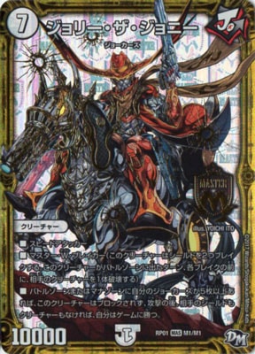 ジョリー・ザ・ジョニー MAS 無色[ジョーカーズ] (7) クリーチャー:ジョーカーズ 10000 スピードアタッカー マスター・W・ブレイカー(このクリーチャーはシールドを2つブレイクする。このクリーチャーがバトルゾーンに出たターン、各ブレイクの前に、相手のクリーチャーを1体破壊する。) バトルゾーンまたはマナゾーンに自分のジョーカーズが5枚以上あれば、このクリーチャーはブロックされず、攻撃の後、相手のシールドもクリーチャーもなければ、自分はゲームに勝つ。