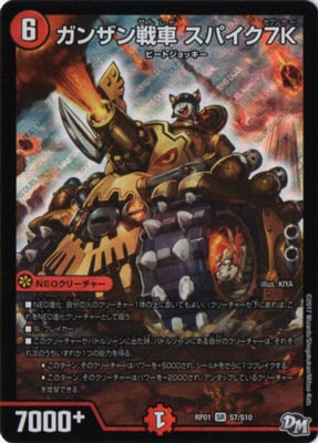 ガンザン戦車 スパイク7K SR 火文明 (6) NEOクリーチャー:ビートジョッキー 7000+ NEO進化:自分の火のクリーチャー1体の上に置いてもよい W・ブレイカー このクリーチャーがバトルゾーンに出た時、バトルゾーンにある自分のクリーチャーは、それぞれ次のうちいずれか1つの能力を得る。 ?このターン、そのクリーチャーのパワーは+5000され、シールドをさらに1つブレイクする。 ?このターン、そのクリーチャーのパワーは+2000され、アンタップしているクリーチャーを攻撃できる。