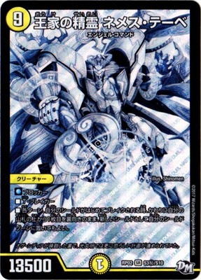 王家の精霊 ネメス・テーベ SR 光文明 (9) クリーチャー:エンジェル・コマンド 13500 ブロッカー T・ブレイカー 各ターン、自分のシールドがはじめてブレイクされる時、かわりに自分の山札の上から1枚目を裏向きのまま、新しいシールドとして自分のシールドゾーンに置いてもよい。