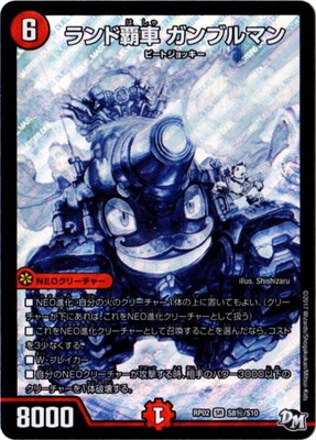 ランド覇車 ガンブルマン SR 火文明 (6) NEOクリーチャー:ビートジョッキー 8000 NEO進化:自分の火のクリーチャー1体の上に置いてもよい。(クリーチャーが下にあれば、これをNEO進化クリーチャーとして扱う) これをNEO進化クリーチャーとして召喚することを選んだなら、コストを3少なくする。 W・ブレイカー 自分のNEOクリーチャーが攻撃する時、相手のパワー3000以下のクリーチャーを1体破壊する。