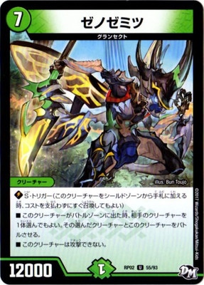 ゼノゼミツ UC 自然文明/ (7) クリーチャー:グランセクト 12000 S・トリガー このクリーチャーがバトルゾーンに出た時、相手のクリーチャーを1体選んでもよい。その選んだクリーチャーとこのクリーチャーをバトルさせる。 このクリーチャーは攻撃できない。