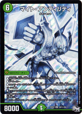 マイト・アンティリティ SR 自然文明 (6) NEOクリーチャー:グランセクト 8000 NEO進化:自分の自然のクリーチャー1体の上に置いてもよい。 W・ブレイカー このクリーチャーがバトルゾーンに出た時、クリーチャーを2体、自分の墓地からマナゾーンに置く。 キズナプラス(このクリーチャーが攻撃する時、その下にあるカードを1枚、自分の墓地に置いても良い。そうしたら、このクリーチャーと自分の他のクリーチャー1体のKP能力を使う) KP−コスト4以下のクリーチャーを1体、自分のマナゾーンからバトルゾーンに出す。