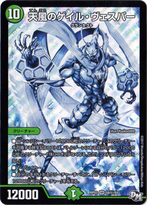 天風のゲイル・ヴェスパー SR 自然文明 (10) クリーチャー:グランセクト 12000 W・シンパシー:パワー12000以上のクリーチャー(このクリーチャーを召喚する時支払うコストは、バトルゾーンにある自分のパワー12000以上のクリーチャー1体につき2少なくなる。ただしコストは0以下にならない) T・ブレイカー 自分の手札にあるクリーチャーすべてに、「W・シンパシー:パワー12000以上のクリーチャー」を与える。
